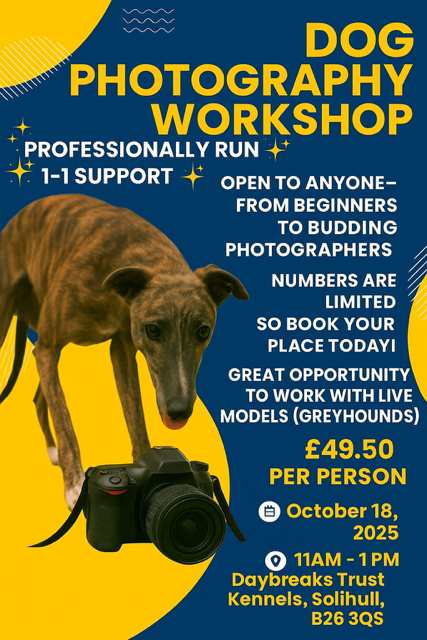We’re delighted to be collaborating with the talented Sharron Alexandra Photography, who has kindly agreed to host this exciting workshop. Even better — all proceeds will go directly towards the care and rehoming of former racing greyhounds.
